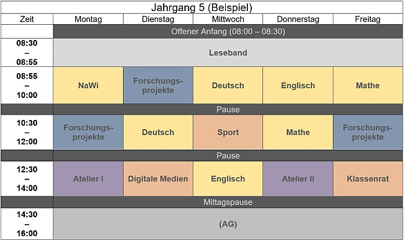 In diesem Beispielstundenplan des 5. Jahrgangs können Sie auch unser Stundenraster, also die Unterrichtszeiten unserer Schule, einsehen.
