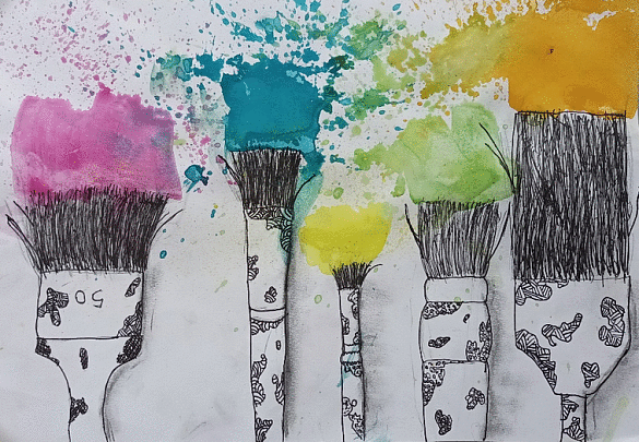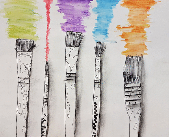 Alte Pinsel aus dem Atelier hatte ich den Schülerinnen und Schülern mit in den Unterricht gebracht. Werkzeuge mit erzählerischem Charakter für unterschiedliche Zwecke untersuchten die jungen Ästheten und setzten sie in ihren Werkspuren grafisch um. Dabei stand das proportionale Übertragen des Gesehenen im Zentrum der Auseinandersetzung. Mit erfundenen Schraffuren übersetzten sie frei den haptischen Eindruck. Entstanden sind kolorierte Zeichnungen aus Fineliner und Zeichenkohle. Damit spürten sie der Arbeitsweise des amerikanischen Pop Art Künstlers Jim Dine nach und lieferten damit Potenzial zum Imaginieren unterschiedlicher Künstlergeschichten.