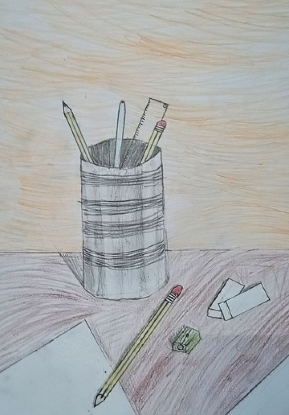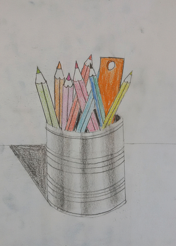 Alte Konserven bieten nicht nur Stauraum für diverses Zeichenwerkzeug. Sie lassen sich sogar wunderbar zeichnen! Die Ellipse in ihrer Gleichmäßigkeit darzustellen, ist ein schwieriges Unterfangen. Aber eine „olle“ Büchse verzeiht uns kleine Dellen! Hier erprobten die Schülerinnen und Schüler mittels der Linie als raumbildendes Mittel, aber auch durch Überlappung und Überschneidung kompositorisch den Bildraum zu erweitern.