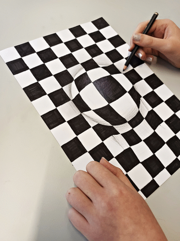 In diesem Themenbereich hat der Kurs praktisch die optische Täuschung erprobt und erkundet, wie Künstler die Sehgewohnheiten irritieren. Dabei haben die Schülerinnen und Schüler die geometrische Grundform Quadrat und Kreis durch eine gezielte Verzerrung mittels der Kreuzkontur in ihrer geordneten Rhythmik aufgelöst und damit eine räumliche Bildillusion erzeugt. Sie haben die Kunstströmung Op Art am Beispiel Viktor Vasarelys erkundet und kennen gelernt.